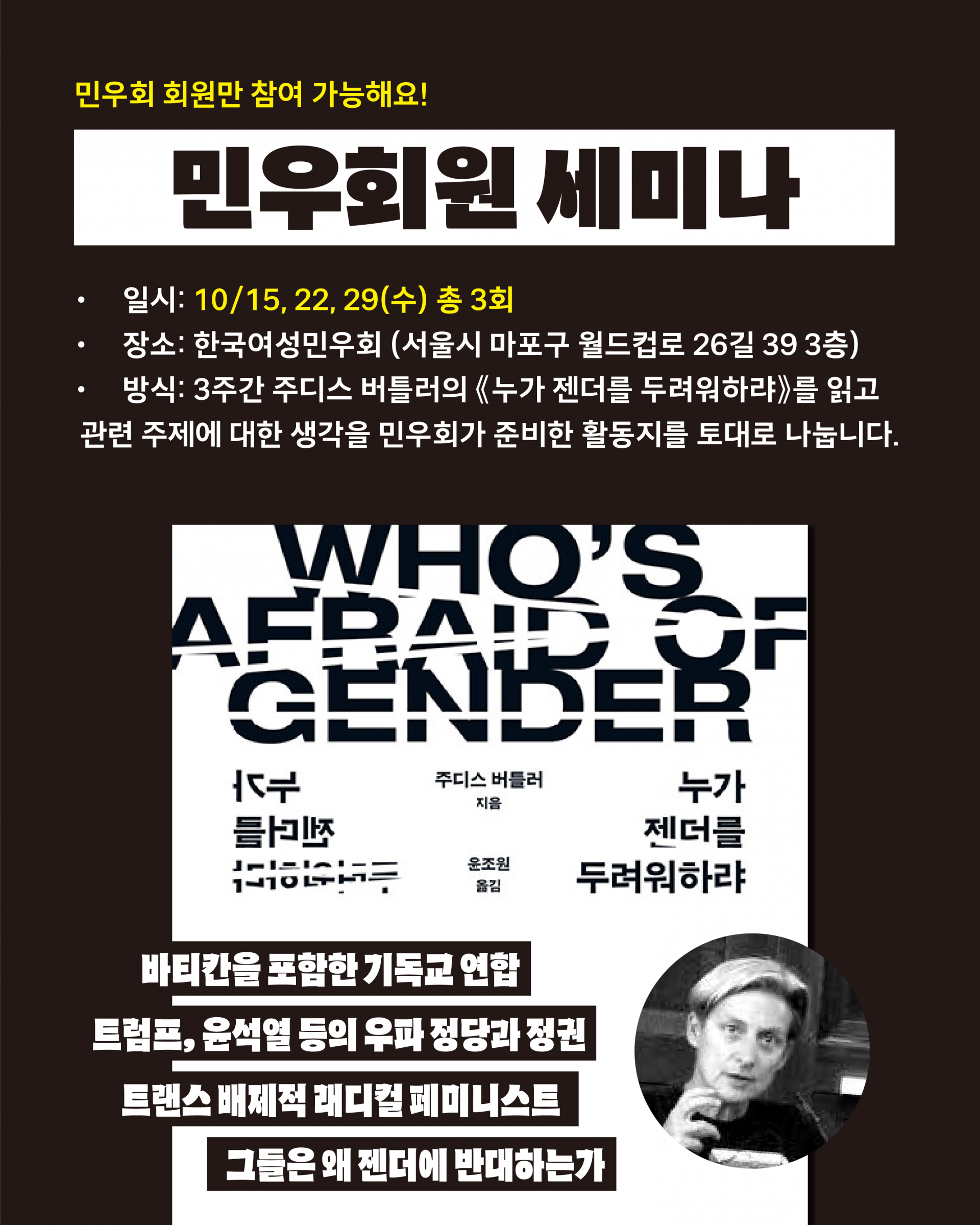 ์ผ์: 19:30 ์ด5ํ 9/24, 10/1, 10/15, 10/22, 10/29 (์) ๐ฎ ์ฅ์: ํ๊ตญ์ฌ์ฑ๋ฏผ์ฐํ ์ฌ๋ฌด์ค ๐ ๋์ : ๋ฏผ์ฐํ ํ์ 6๋ช