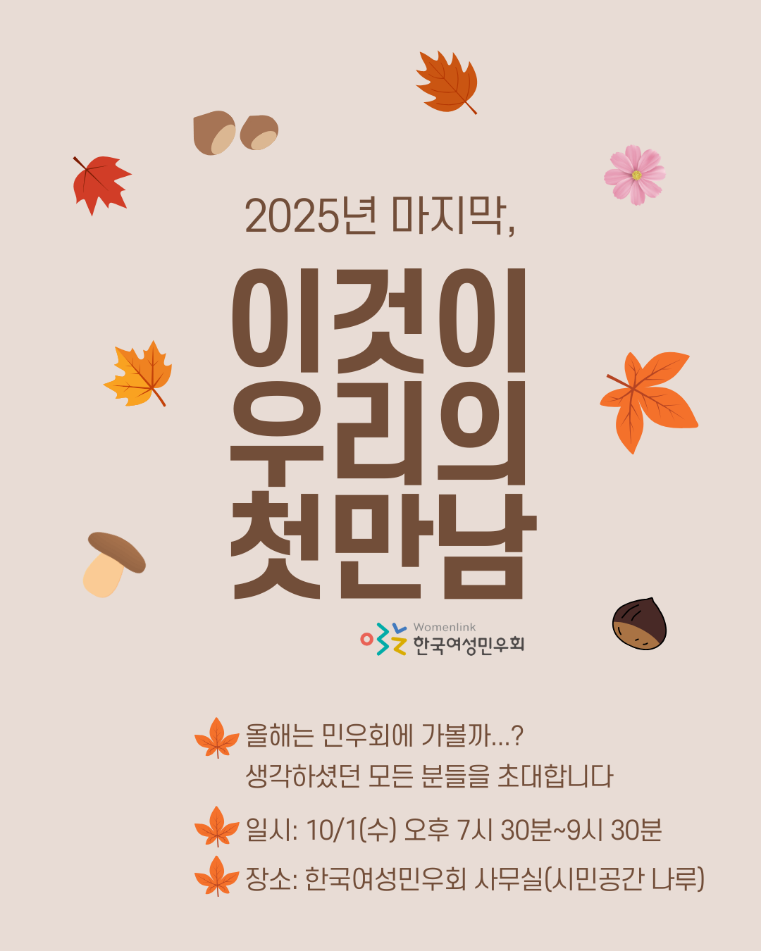 ์ผ์: 10/1(์) 19:30 โป์ ์ฐฉ์ ๐ฎ ์ฅ์: ํ๊ตญ์ฌ์ฑ๋ฏผ์ฐํ ์ฌ๋ฌด์ค ๐ ๋์ : ๋ฏผ์ฐํ ํ์ |