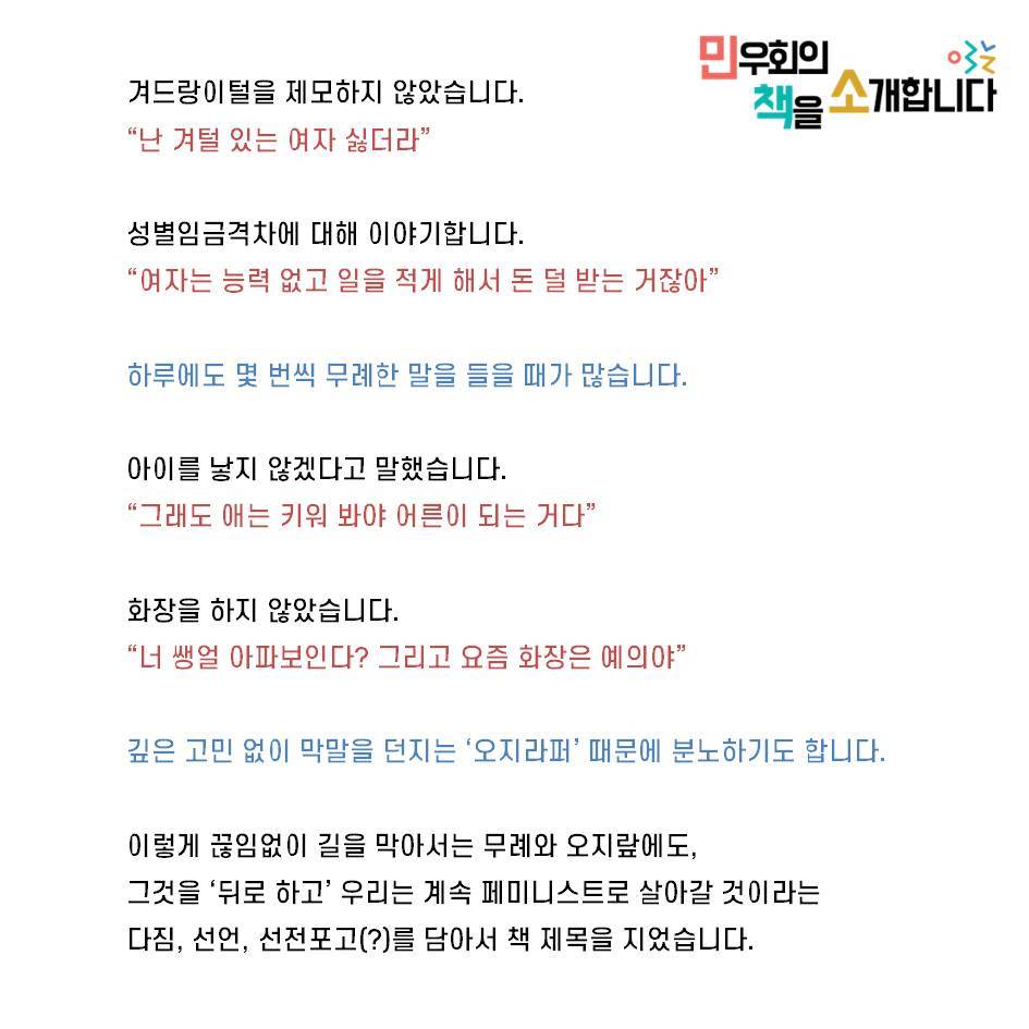 처음 페미니즘을 접했을 때, 페미니스트로 살아간다는 것이 무엇인지 고민될 때, 페미니스트로 살아가는 것이 지칠 때, 이 책이 읽혀지길 바랍니다.