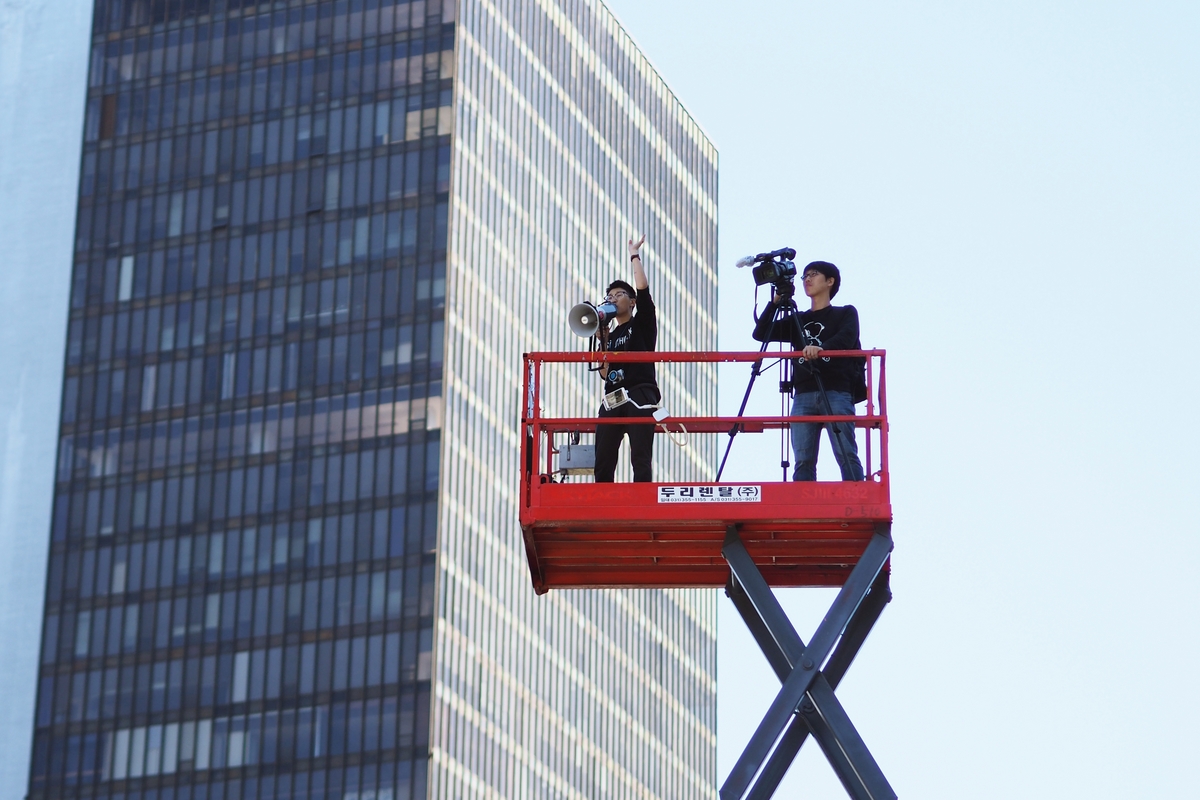 차례가 되어 면접실 안으로 들어갔더니 훈훈하고 촉촉한 공기 속에 여러 사람이 책상에 둘러 앉아 있었다. 처음 뵙는 분도 있었지만 얼마 전 참석했던 총회에서, 형법 269조 삭제 퍼포먼스에서 보았던 분들이 계셨다. 줄넘기를 넘으면서 사업계획 발표하던 분이네. 엄청 높은 유압식 사다리에 올라가 있던 뾰족 머리 모양을 하신 분도 있고. 떨리긴 해도 아는 얼굴이 있다는 것만으로도 약간의 안도감이 들었다. 역시 민우회 가입하길 잘했나 하는 생각이 들었다.