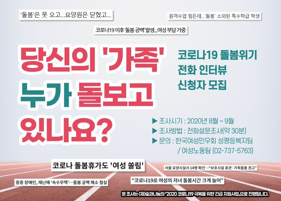 2020년 2월, 이미 위태로웠던 돌봄하는 여성들의 일상이 더 큰 위기에 처했다. 코로나바이러스감염증-19(이하 코로나19)의 확산과 그에 따른 방역 정책으로 어린이집, 학교, 공공기관이 한순간에 문을 닫았다. 그야말로 ‘돌봄 공백’이 발생하자 정부에서 겨우 내놓은 정책은 가족에게 돌봄 책임을 고스란히 떠넘기는 ‘가족돌봄휴가 지원’과 긴급할 경우에만 국가가 돌봄을 담당한다는 인식을 드러내는 ‘긴급돌봄’이었다. 과연 이 상황을 여성들은 어떻게 버티고 있는 걸까? 돌봄 위기 속에서 아이 돌봄을 하고 있는 여성 89명을 전화와 서면을 통해 만났다.