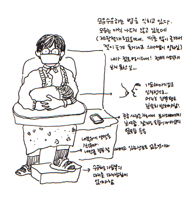 병원 수유실에서는 선생님이 대뜸 내 가슴을 쥐고 아기의 입에 밀어 넣었다. 예고도 없이 가슴을 잡혔다는 사실과 배고픔에 헐떡이며 유두를 무는 아기를 보며 얼떨떨했다. 나는 그렇게 얼떨떨한 상태로 엄마가 됐다. 아직 아기 손 한 번 잡아보지도 못했는데. 친밀감을 쌓을 시간도 없이 겪은 갑작스런 신체접촉이었다. 아기는 젖이 부족한 내 가슴을 물다가, 분유로 배를 채워주던 선생님의 목소리가 들리자, 젖을 퉤 뱉고는 자지러지게 울었다. 그날은 나도 병실에서 울었다.