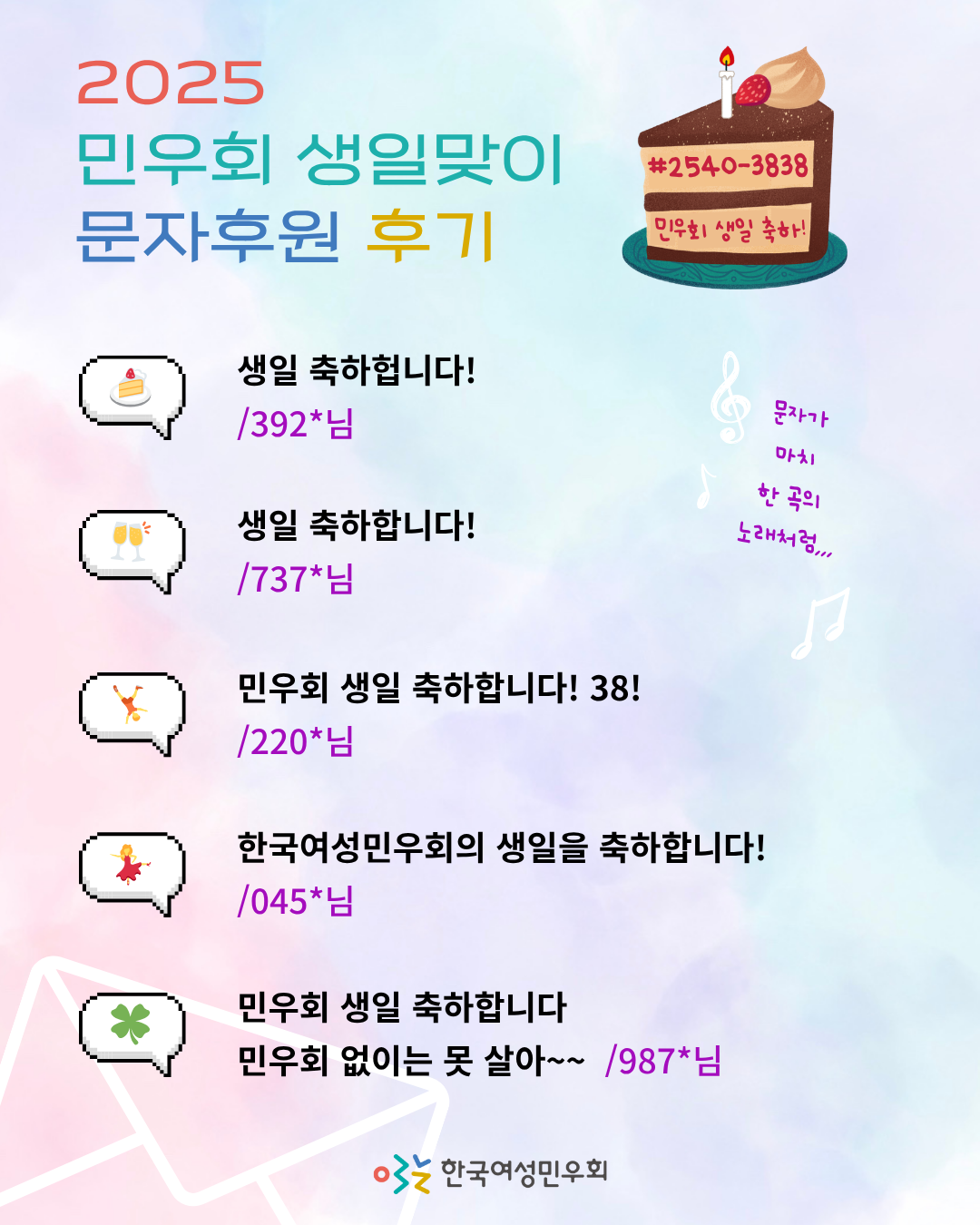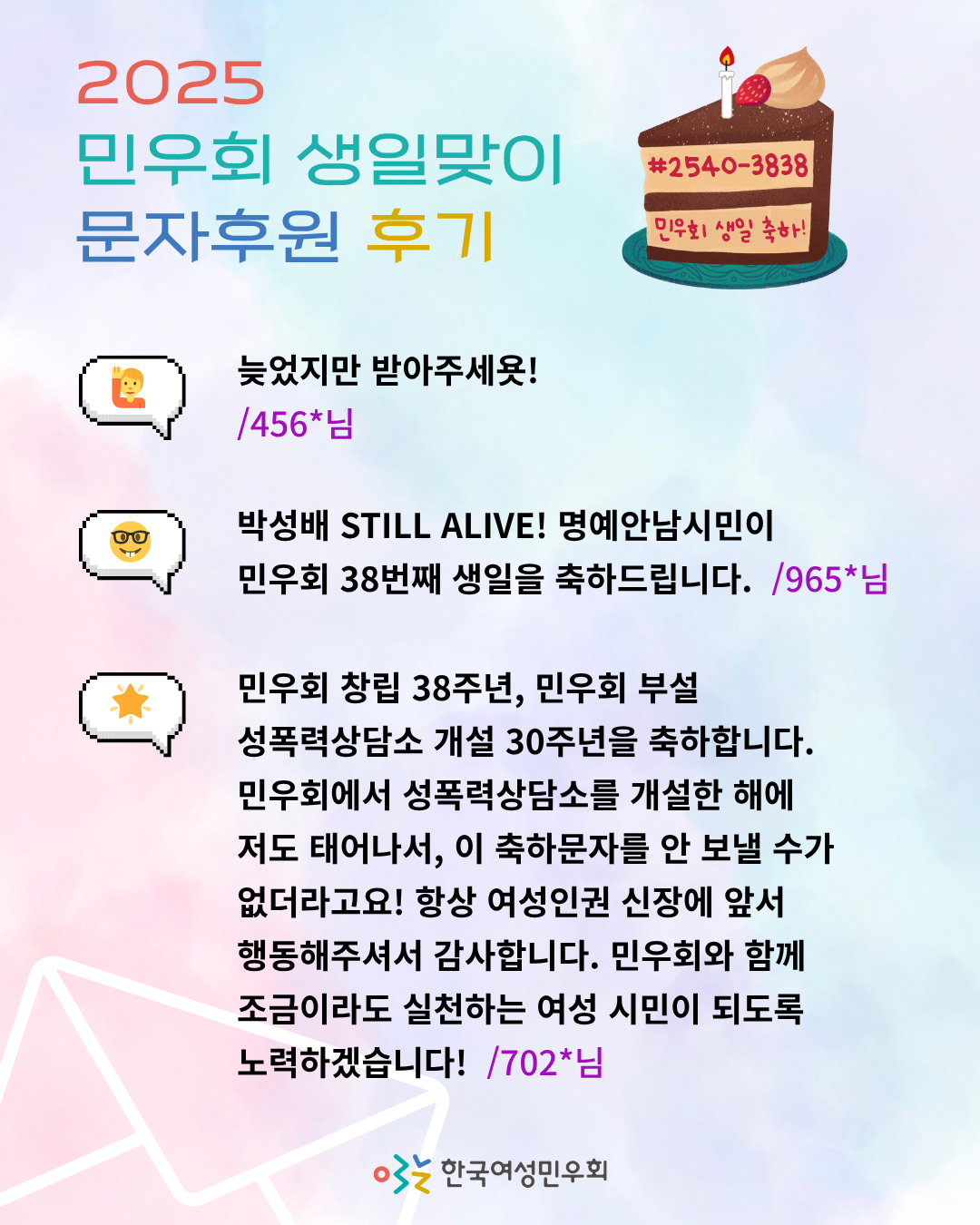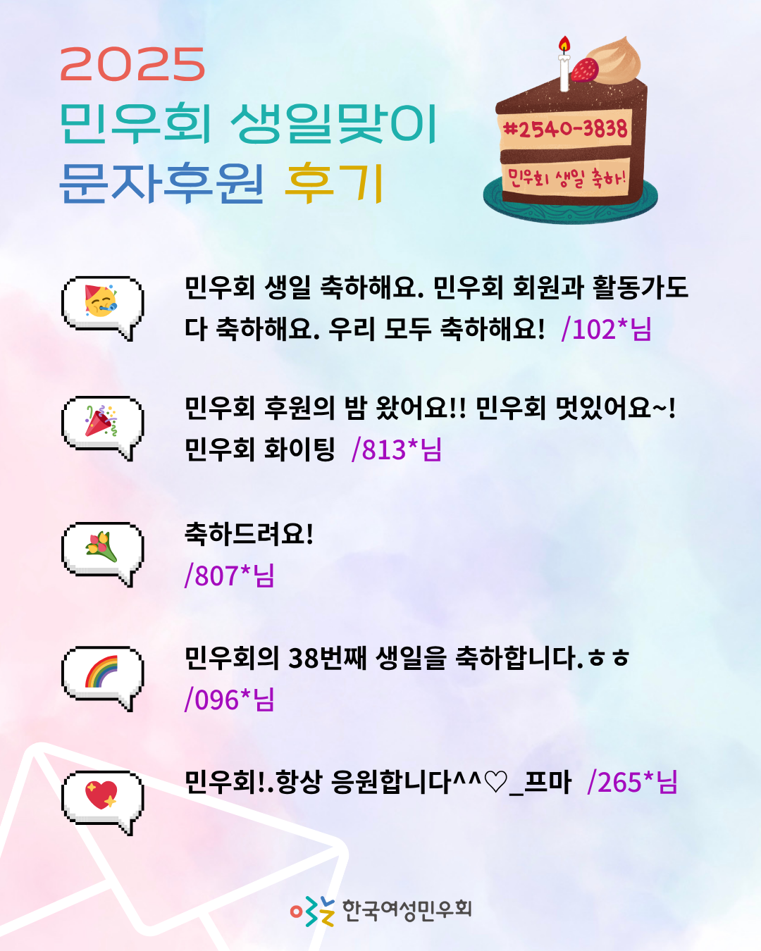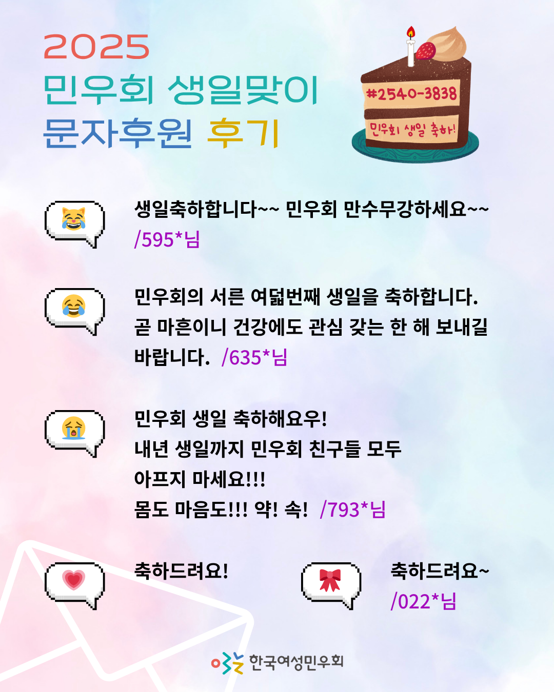 ✉️ 민우회 생일 축하해요. 민우회 회원과 활동가도 다 축하해요. 우리 모두 축하해요! /102*님