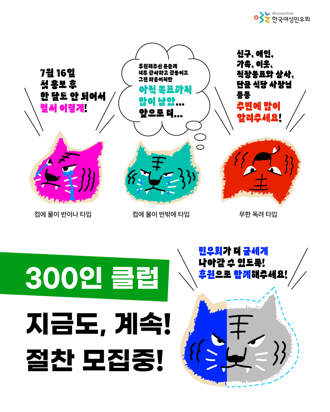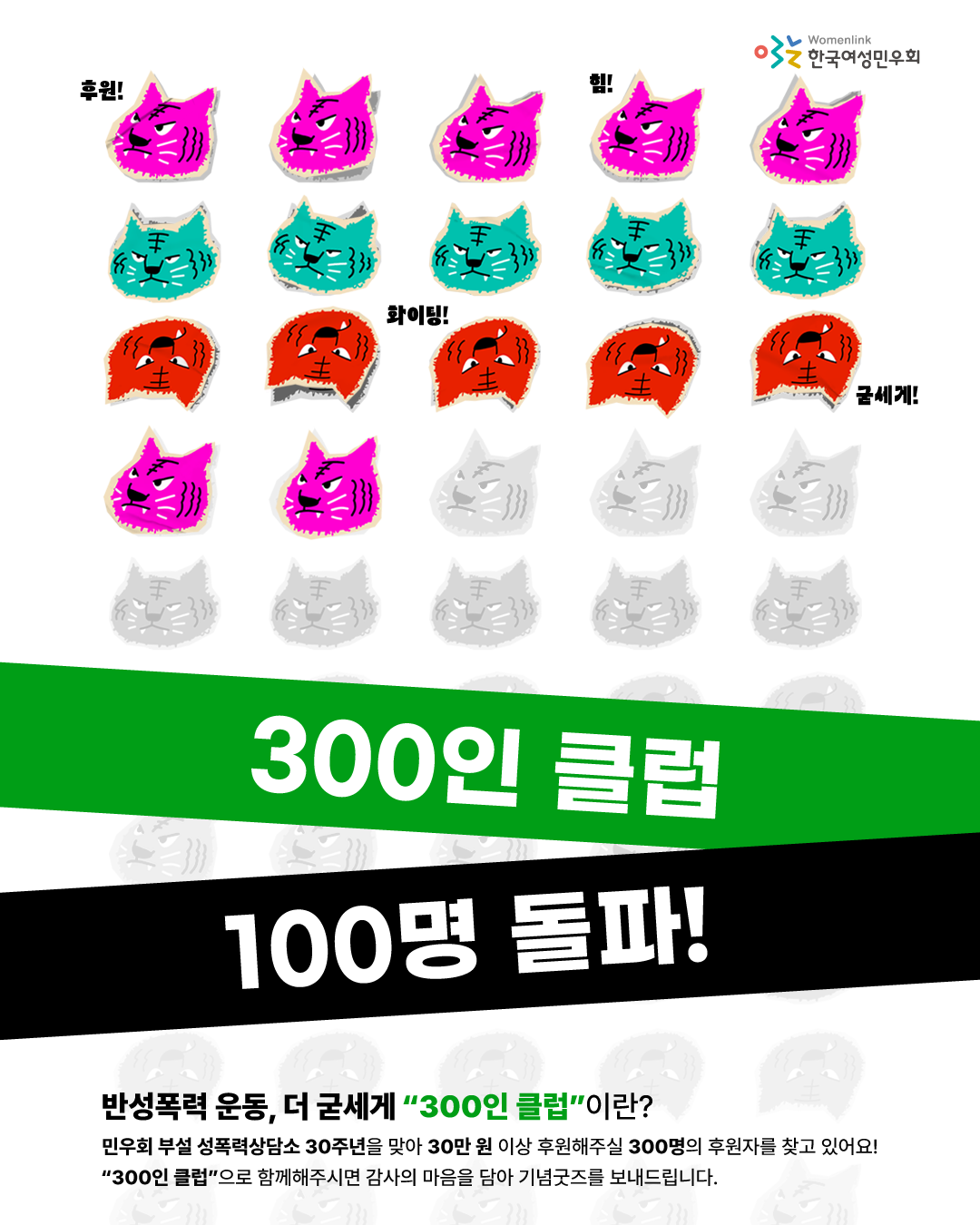 [내용 설명] 300인 클럽 100명 돌파! / 반성폭력 운동, 더 굳세게 "300인 클럽"이란? 민우회 부설 성폭력상담소 30주년을 맞아 30만 원 이상 후원해주실 300명의 후원자를 찾고 있어요! "300인 클럽"으로 함께해주시면 감사의 마음을 담아 기념굿즈를 보내드립니다.