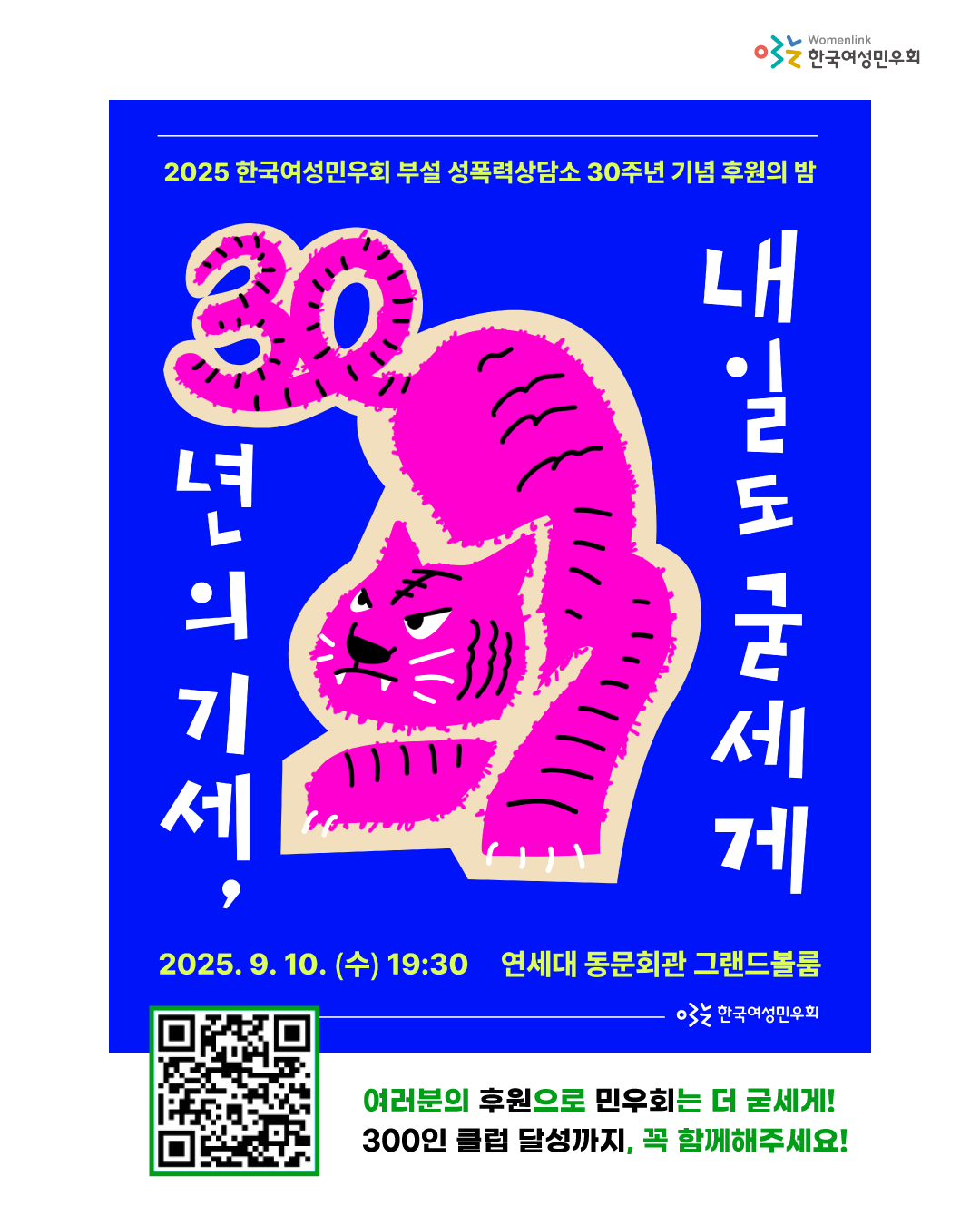 [내용 설명] 2025 한국여성민우회 부설 성폭력상담소 30주년 기념 후원의 밤 / 30년의 기세, 내일도 굳세게 / 2025. 9. 10.(수) 19:30 / 연세대 동문회관 그랜드볼룸 / 여러분의 후원으로 민우회는 더 굳세게! 300인 클럽 달성까지, 꼭 함께해주세요!