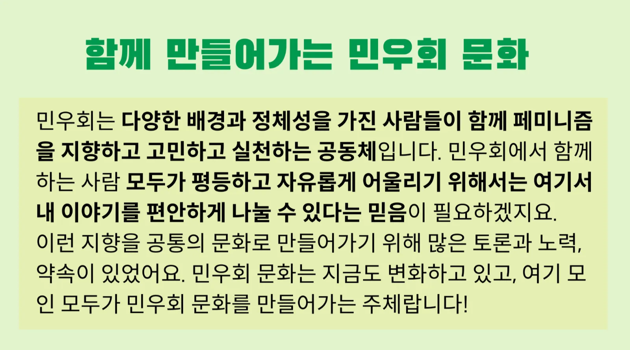 본격적으로 모임을 시작하기 전에 먼저, 페미니즘을 고민하고 실천하는 공동체로서 민우회에서 평등하고 편안하게 관계맺기 위한 약속문을 함께 읽었어요.