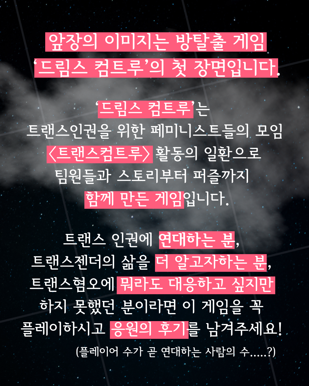 ‘드림스 컴트루’는 트랜스인권을 위한 페미니스트들의 모임 〈트랜스컴트루〉 활동의 일환으로 팀원들과 스토리부터 퍼즐까지 함께 만든 게임입니다.