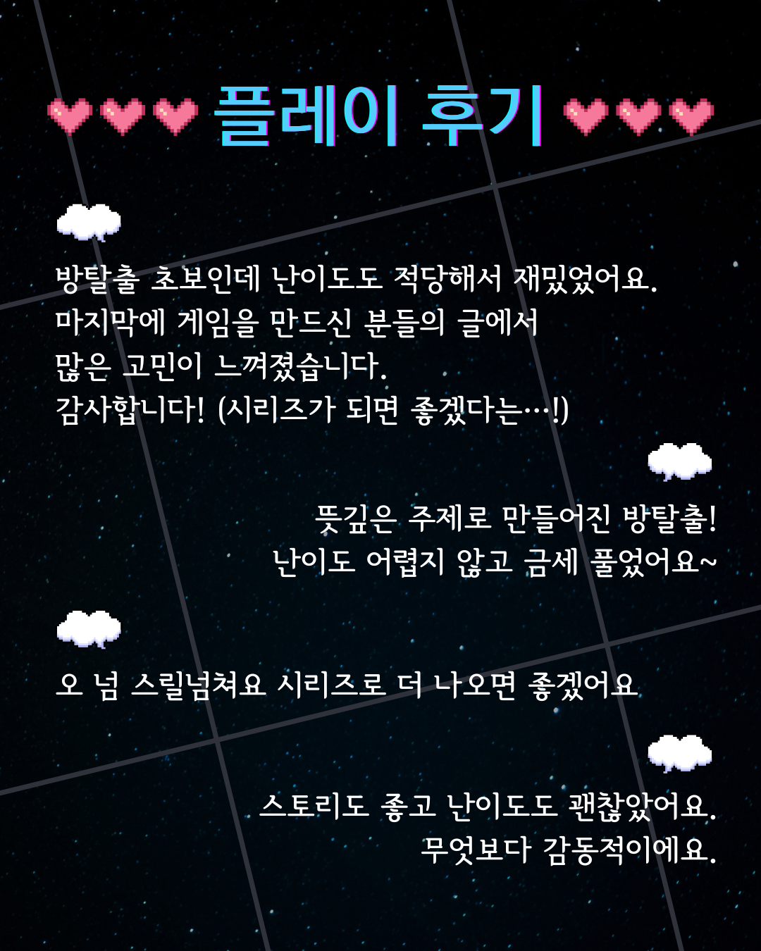 💬방탈출 초보인데 난이도도 적당해서 재밌었어요. 마지막에 게임을 만드신 분들의 글에서 많은 고민이 느껴졌습니다.