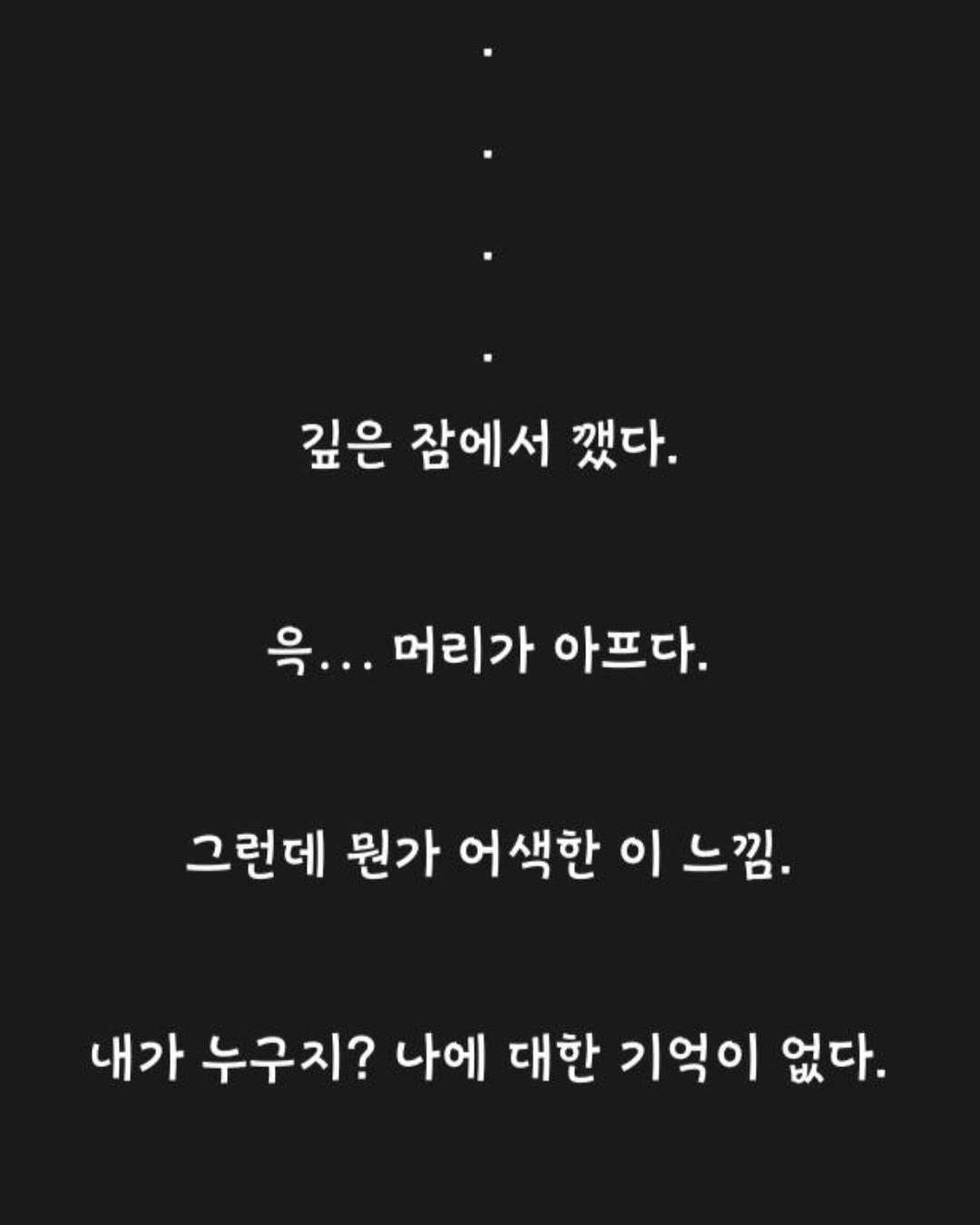 (이미지: 게임의 한 장면/ 대사: 깊은 잠에서 깼다. 윽 머리가 아프다 그런데 뭔가 어색한 이 느낌. 내가 누구지? 나에 대한 기억이 없다)