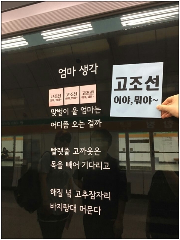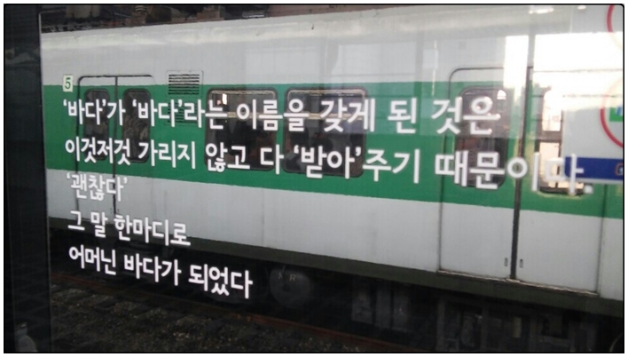 지하철 스크린도어 위의 시 ‘엄마 생각’입니다.“맞벌이 하느라 바쁜 엄마를 생각한다면 빨래 정도는 개켜둘 수 있잖아요.”