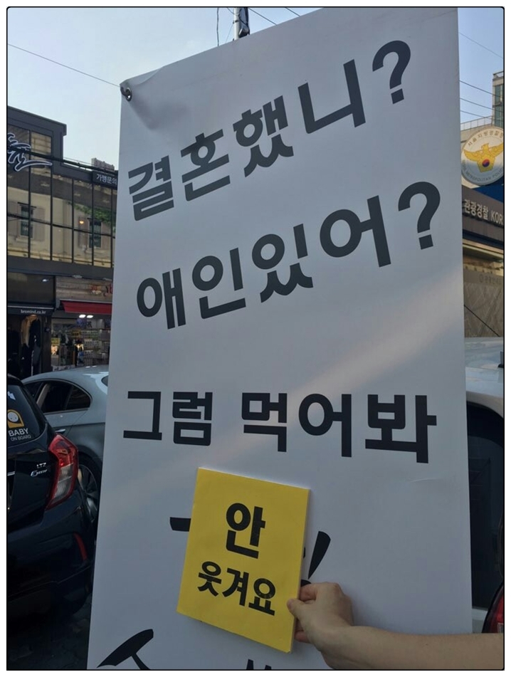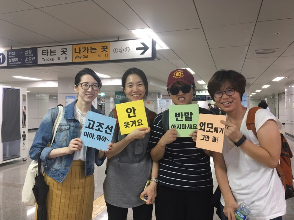 경찰서 바로 옆에서 ‘아가씨 00명 항시 대기!’, ‘북창동식 어쩌고~’라고 버젓이 광고하고 있는 업소들 앞에서 우리는 치를 떨며 포스트잇으로 도배해서 다 감춰버릴까 얘기도 했고요, 성형외과 광고에 ‘외모얘기 그만 좀’을 붙이면서 제가 성형외과에서 상담 받느라 날린 10만원을 떠올리며 애도했습니다.ㅠㅠ 성역할 고정관념을 강요하는 광고들에는‘고조선이야 뭐야’ 포스트잇을 붙였어요. ‘혼자이긴 아까운 당신’이라고? 내가 아직 결혼하기는 좀 아깝단 생각이 든단 말예요! 마지막으로 우리는 가슴팍에 첫사람 포스트잇을 붙였습니다. 그리고 저를 이끌어준 많은 첫사람들을 생각했습니다. |