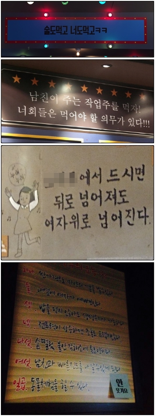 술집에 붙어 있는 각종 선정적인 드립들. 이게 웃긴가요? 전혀 안.웃.겨.요.