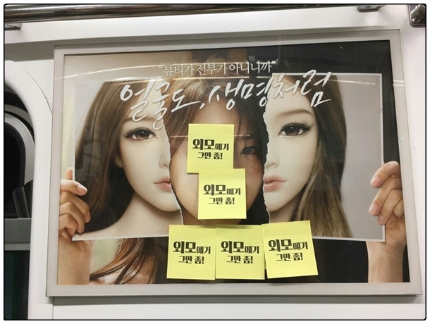 성형 광고, 지하철 같은 공공장소에서 그만 보고 싶습니다. ‘얼굴도 생명처럼?’ “얼굴에 생명을 걸어야 하나요?”