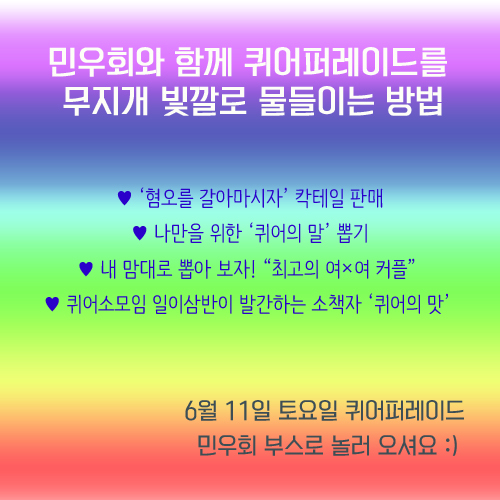 6월 11일 토요일, 퀴어퍼레이드 민우회 부스로 놀러 오셔요.