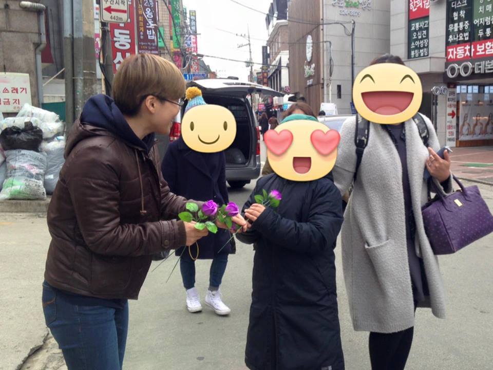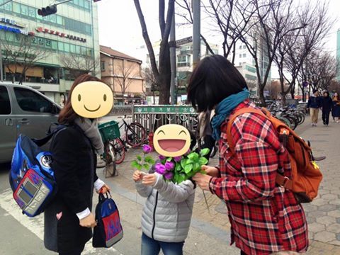 그리고. 3월 8일 당일에는 망원동 시장 일대에 나가서 남은 보라 비누 꽃을 나눠드렸어요.