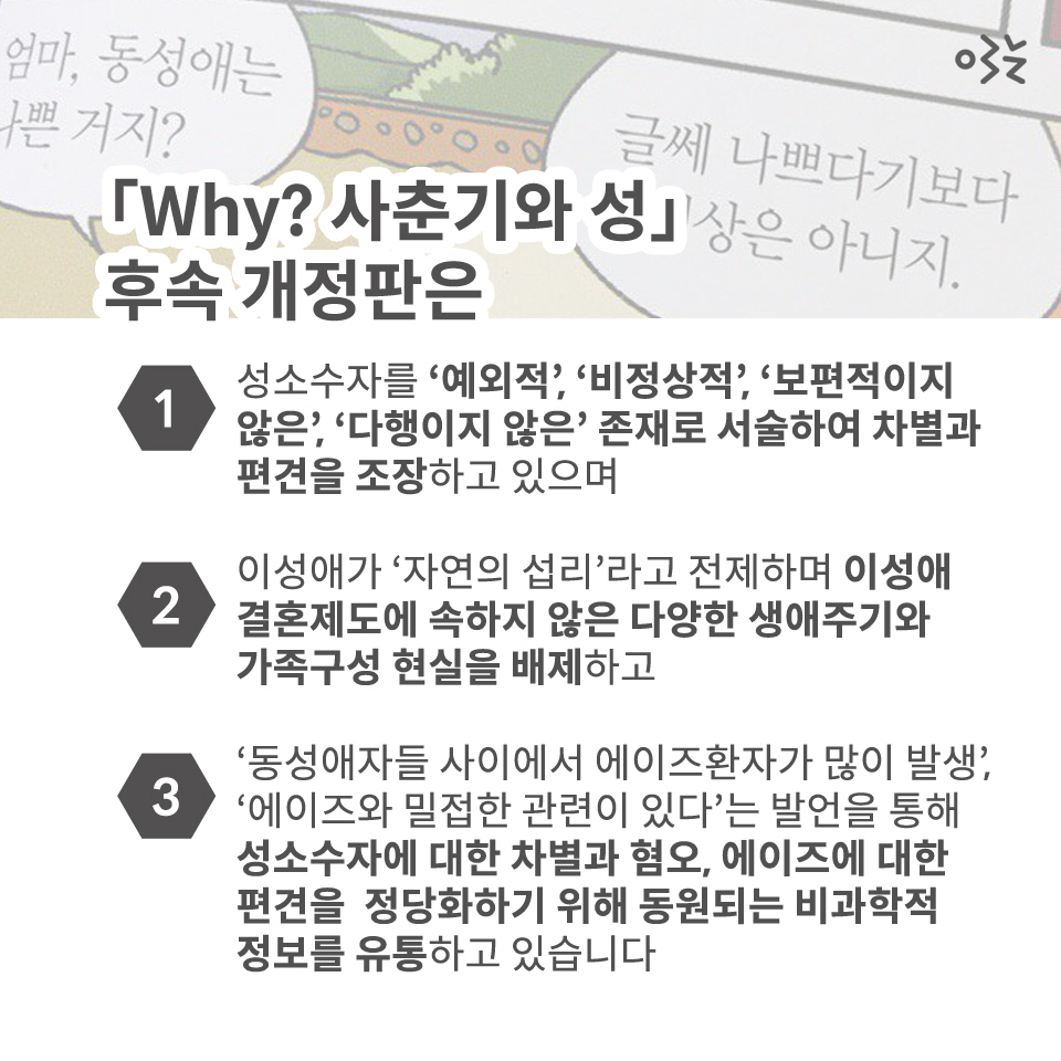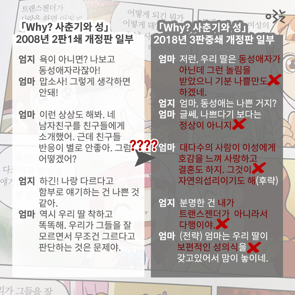 「Why? 사춘기와 성」2008년 2판1쇄 개정판 ▶2018년 3판중쇄 개정판 비교 엄지: 욕이 아니면? 나보고 동성애자라잖아! 엄마: 맙소사! 그렇게 생각하면 안돼! ▶엄마: 저런, 우리 딸은 동성애자가 아닌데 그런 놀림을 받았으니 기분나쁠만도 하겠네 엄지: 엄마, 동성애는 나쁜거지? 엄마: 글쎄, 나쁘다기 보다는 정상이 아니지. 엄마: 이런 상상도 해봐. 네 남자친구를 친구들에게 소개했어. 근데 친구들 반응이 별로 안좋아. 그럼 어떻겠어? ▶ 엄마: 대다수의 사람이 이성애게 호감을 느껴 사랑도 하고 결혼도 하지. 그것이 자연의 섭리이기도 해(후략) 엄지: 하긴! 나랑 다르다고 함부로 얘기하는 건 나쁜 것 같아. 엄마: 역시 우리 딸 착하고 똑똑해. 우리가 그들을 잘 모르면서 무조건 그르다고 판단하는 것은 문제야. ▶ 엄지: 분명한 건 내가 트랜스젠더가 아니라서 다행이야. 엄마: (전략)엄마는 우리딸이 보편적인 성의식을 갖고있어서 맘이 놓이네. |