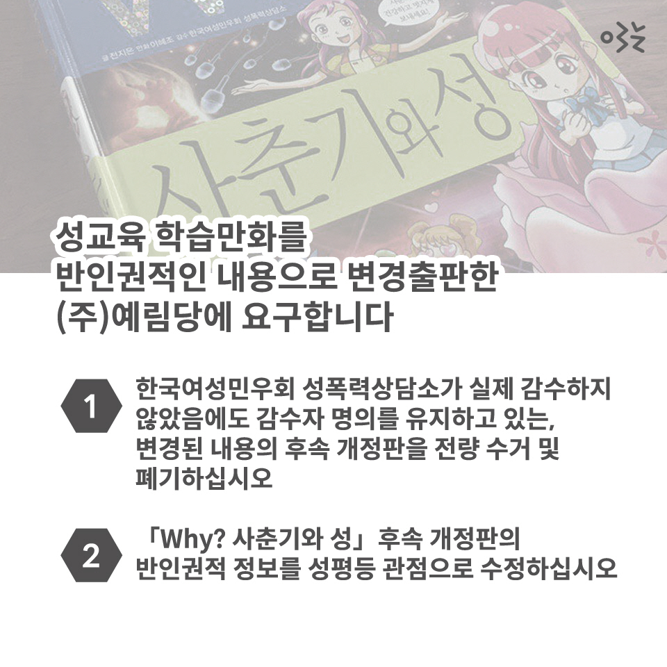 성교육 만화를 반인권적인 내용으로 변경 출판한 (주)예림당에 요구합니다.