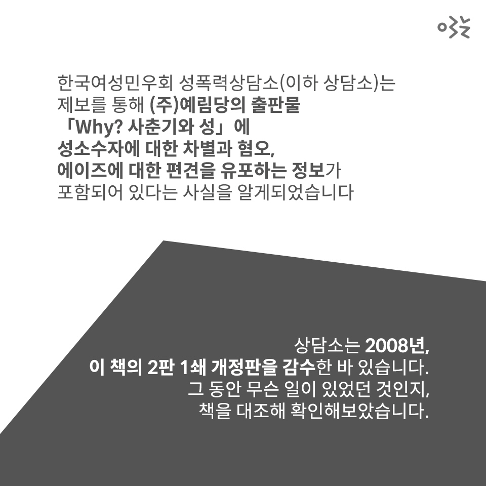 한국여성민우회 성폭력상담소(이하 상담소)는 제보를 통해, (주)예림당의 출판물 「Why? 사춘기와 성」에 성소수자에 대한 차별과 혐오, 에이즈에 대한 편견을 유포하는 정보가 포함되어있다는 사실을 알게되었습니다. 상담소는 2008년 이 책의 2판1쇄 개정판을 감수한 바 있습니다. 그동안 무슨 일이 있었던 것인지, 책을 대조해 확인해보았습니다.
