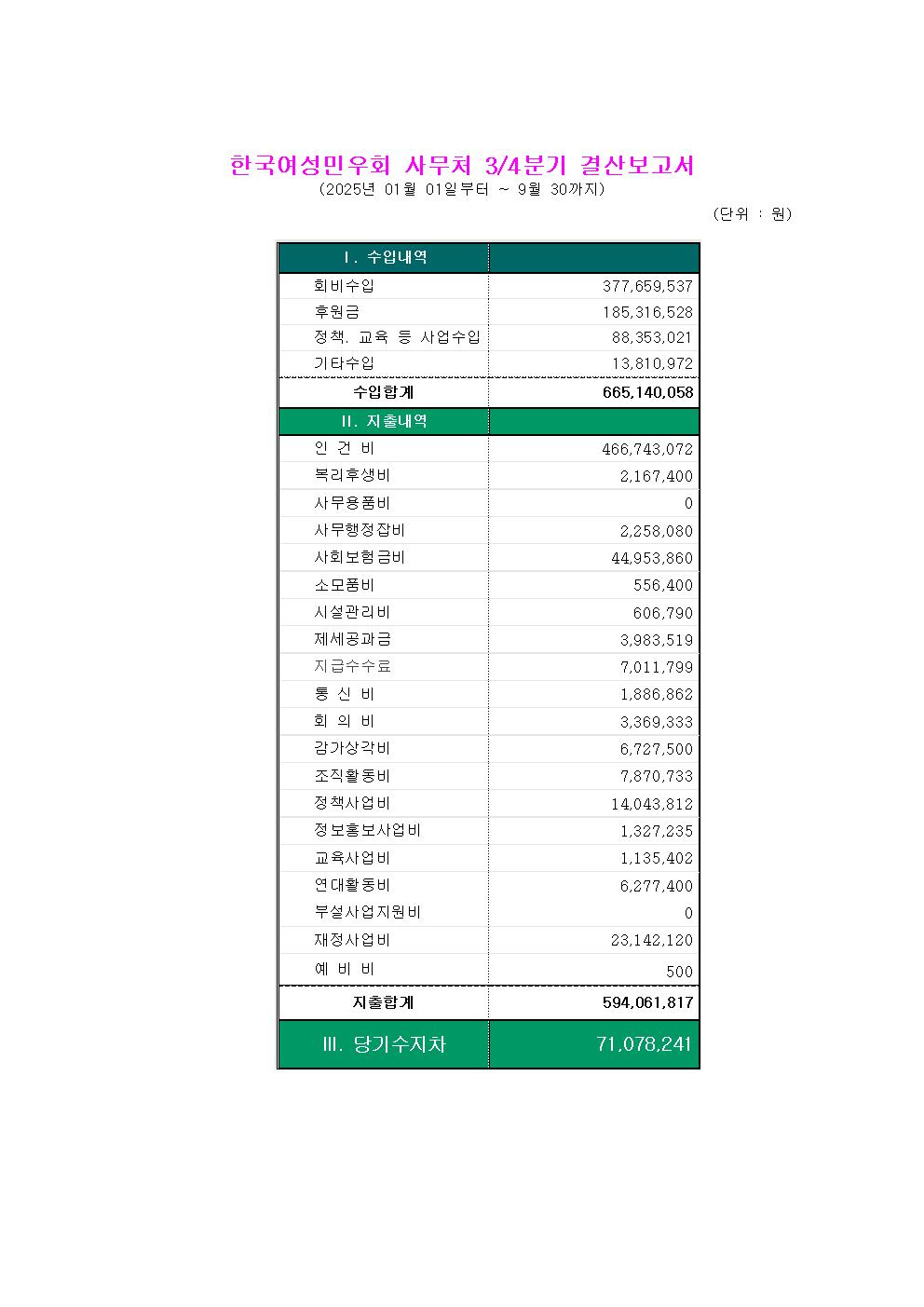 2025년 한국여성민우회 사무처 3/4분기 결산서(2025.01.01~2025.09.30)