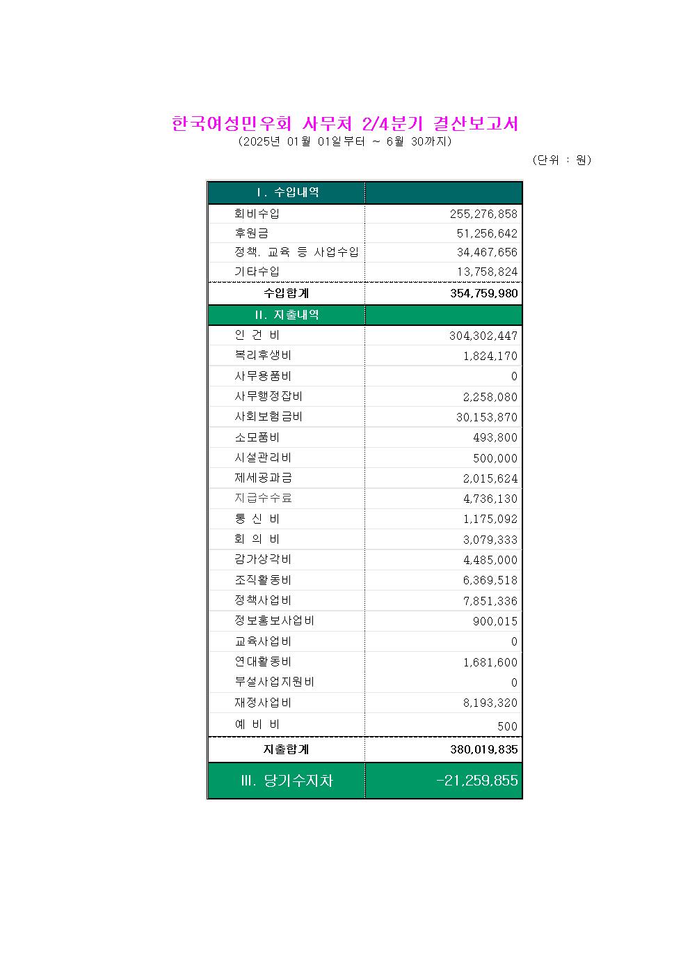 2025년 한국여성민우회 사무처 2/4분기 결산서(2025.01.01~2025.06.30)