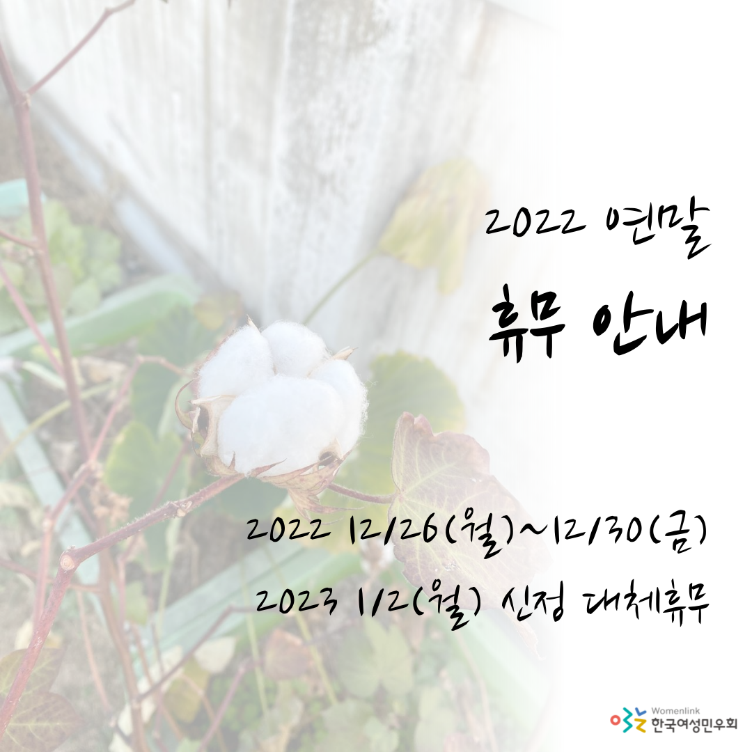(이미지 설명: 옥상 화분에 목화꽃이 피어 있는 배경으로 오른쪽에 [2022 연말 휴무 안내 2022 12/26(월)~12/30(금) 2023 1/2(월) 신정 대체휴무]라는 안내문구가 쓰여있다.)