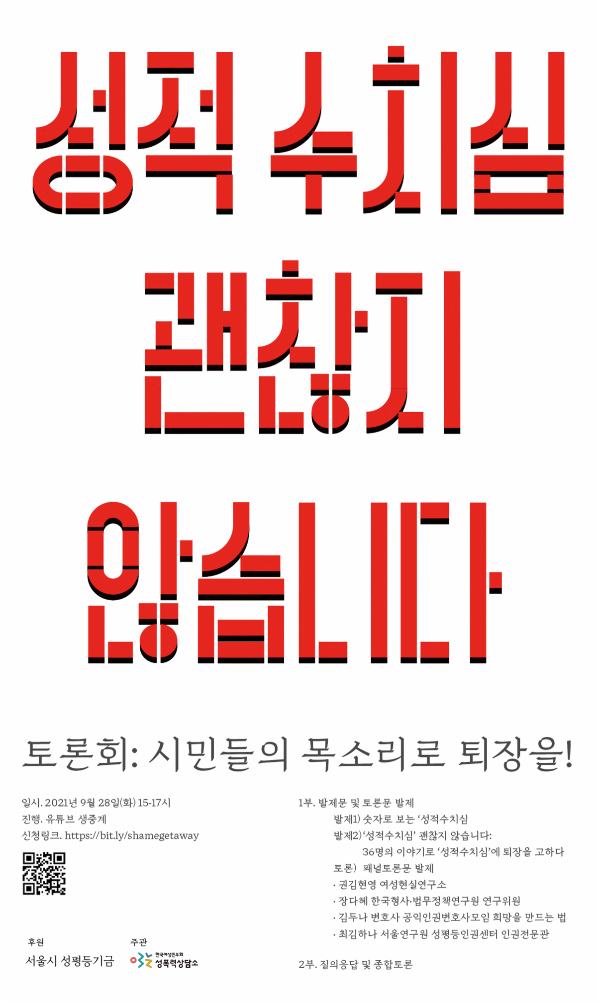 성폭력 사건을 해결하는 과정에서, 직장에서, 수사과정(경/검찰)에서, 재판과정에서 성폭력 사건을 규정한느 주요한 개념으로 '성적수치심'이 쓰이는 장면들을 마주하게 됩니다. 이에 한국여성민우회 성폭력상담소는 '성적수치심'에 대한 우리의 목소리를 다시 한 번 세상에 크게 이야기하고자 합니다.