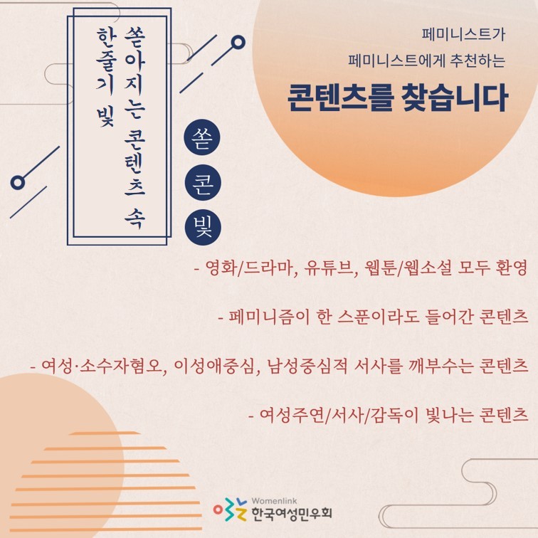 벌써 다음주가 추석인데요! 페미니스트 여러분, 추석에 뭐볼지 콘텐츠 리스트 짜둔거 다 알아요~ 한가위니까 풍성하게 '쏟아지는콘텐츠속한줄기빛'에 콘텐츠 정보를 나누어 주세요! 모집된 콘텐츠는 민우회 쏟콘빛 영업팀의 추천평과 함께 10월에 공개됩니다!