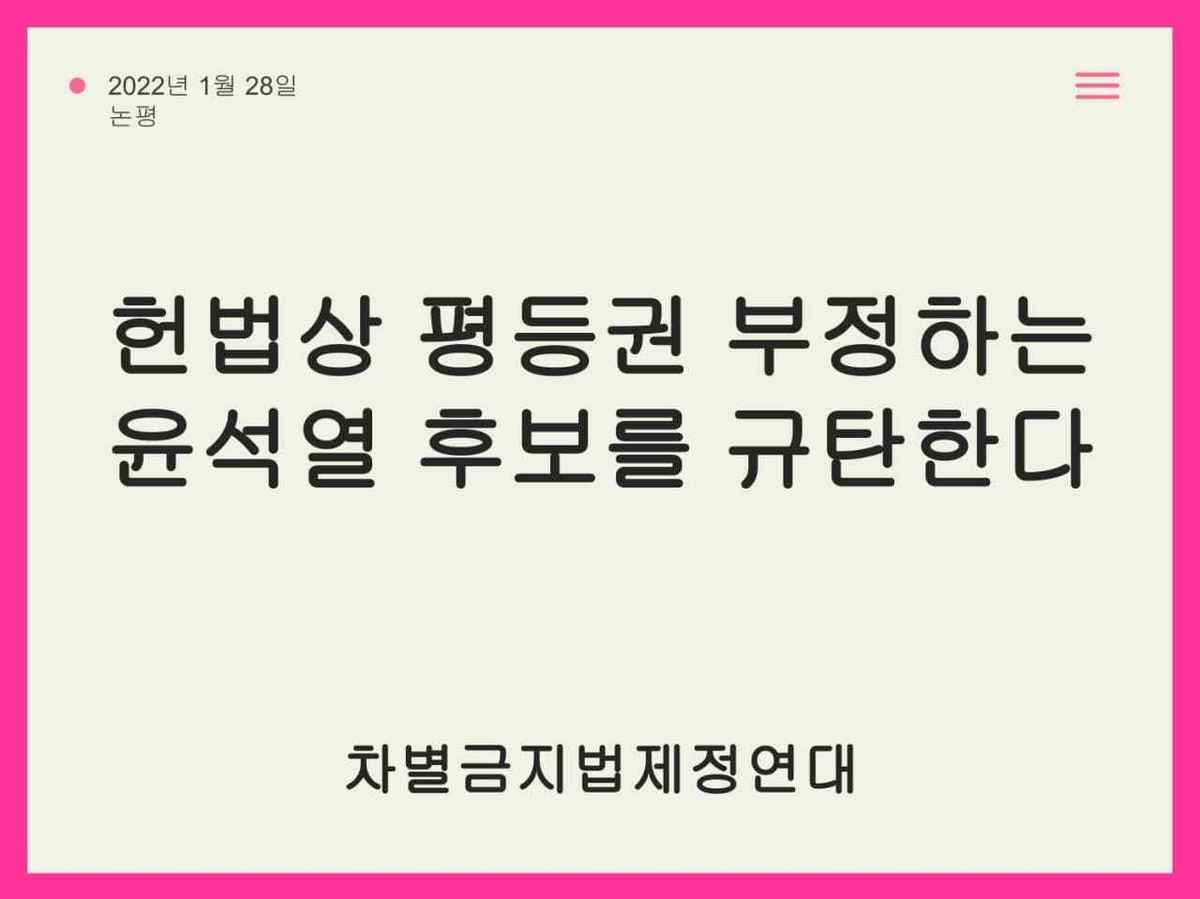 차별금지법의 필요성과 정당성이 이미 널리 합의된 상황에서 기득권층의 억지 주장에 가로막혀 차별금지법 제정이 하루하루 유예되고 있는 현실이야말로 위헌적이다. 시민들은 지금 우리 사회에 필요한 것은 차별 현실을 외면하는 대선이 아니라 차별금지법이라는 점을 연일 외치고 있다. 윤석열 후보와 국민의힘은 차별금지법이 역차별을 운운하며 핑계삼아 미룰 수 없는 인권의 문제임을 직시하고 차별금지법 있는 나라 즉각 제정으로 정치적 책임을 다하라.