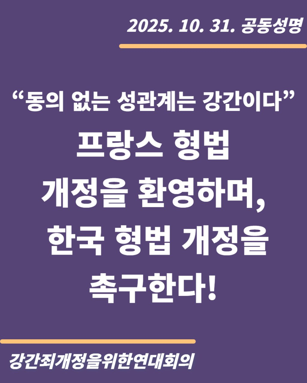 2025년 10월 29일, 프랑스 의회는 형법상 강간죄 정의를 ‘폭행·협박·위협·기습’이 아닌 ‘동의없는 성적행위(tout acte sexuel non consenti)’로 전면 개정했다. 프랑스 형법 제222-23조(강간)은 다음과 같이 개정되었다. “동의는 자유롭고, 알린 바 있으며, 구체적이고, 사전적이며 철회 가능하다. 그것은 정황을 고려하여 평가된다. 피해자의 침묵 또는 반응 없음만으로 동의가 추정될 수 없다.” 또한 "폭력·강제·위협·기습이 존재하는 경우엔 자동으로 동의가 없다"고 규정하는 조문이 더해졌다. ‘폭행 또는 협박’이 있어야만 강간으로 인정하는 틀을 넘어, ‘동의 없으면 성폭력’이라는 원칙을 법률에 담은 것이다. 프랑스 형법상 강간죄 개정을 환영한다.