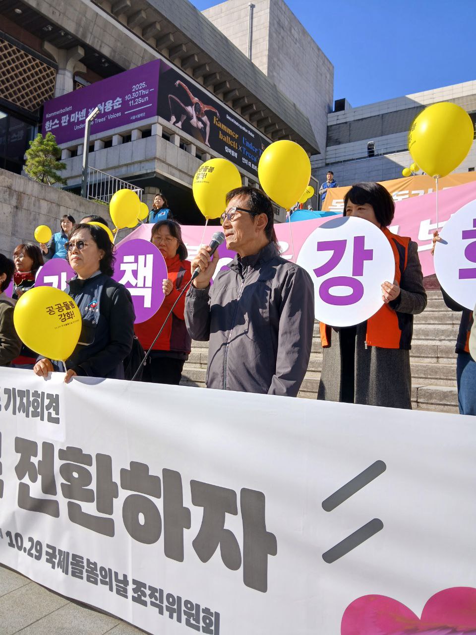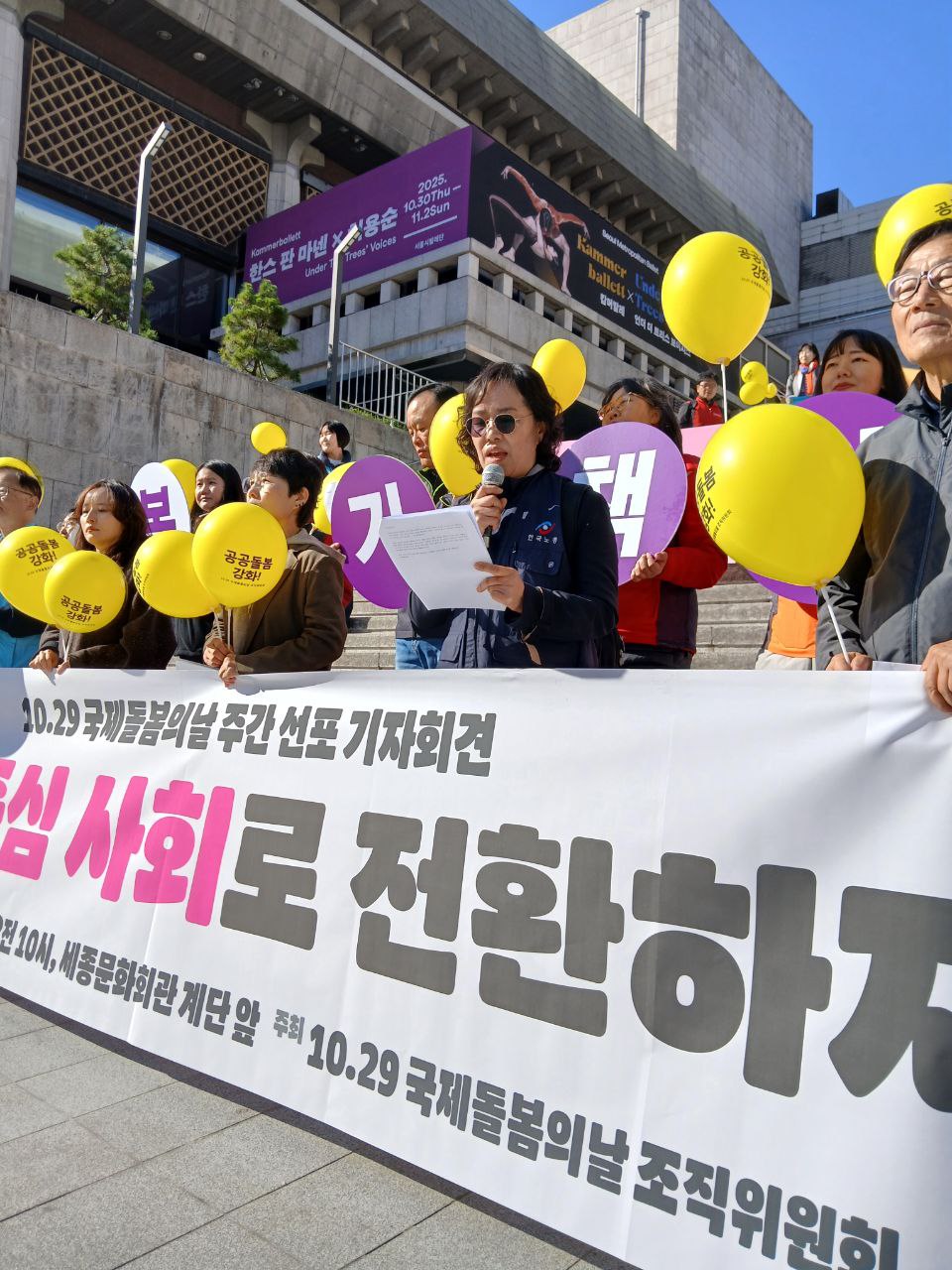 안녕하세요? 저는 10.29 국제돌봄의날 조직위원회에 함께하고 있는 참여연대 전은경입니다. 지난해에 이어 올해도 다양한 여성노동시민사회단체가 우리 사회의 중요한 과제인 ‘돌봄’에 대해 이야기하고자 모였습니다. 유엔에서 매년 10월 29일을 ‘국제돌봄의 날’로 기릴 것을 촉구한 이유는 분명합니다. 돌봄이 더 이상 개인과 가족이 아닌, 사회가 책임져야 하는 일이기 때문입니다.
