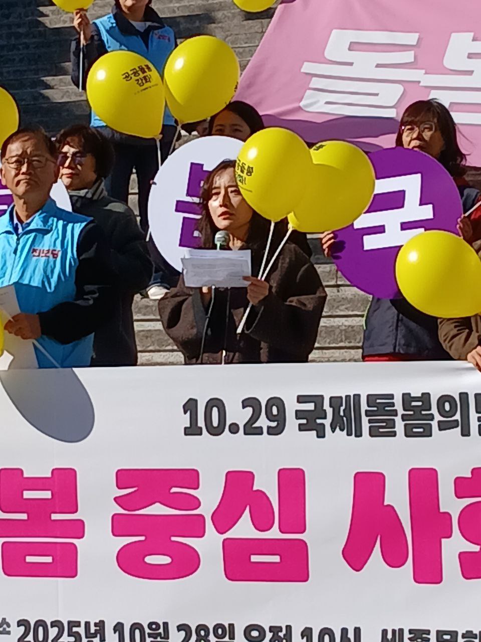 10.29 국제돌봄의날 조직위원회는 돌봄을 인간의 생존과 존엄한 삶을 유지하기 위한 필수적 행위로 개인의 사적 영역에 국한되지 않고, 사회 전체가 공동으로 책임져야 할 영역으로 확장되어야 한다는 것을 강조하고 싶습니다. 이에 기초해 돌봄 받을 권리 보장, 돌볼 권리 보장, 돌봄노동자 권리보장을 요구하는 저희의 목소리에 국가와 지자체, 그리고 모든 시민들이 관심가져주시고 함께해주시길 요청드립니다. 감사합니다.
