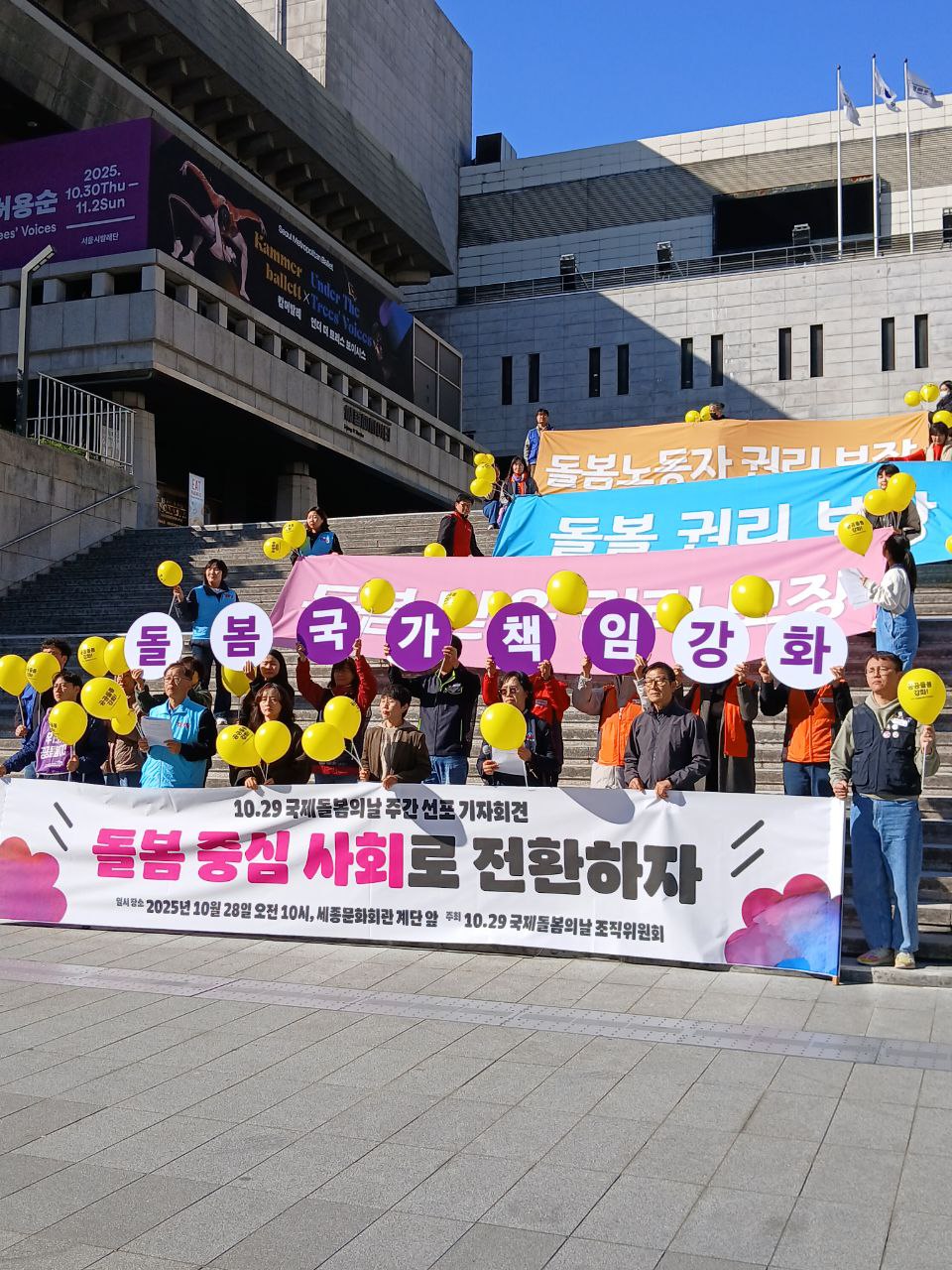 10.29 국제돌봄의날 조직위원회는 돌봄을 인간의 기본적 권리이자 사회적, 공공적 가치로 인정하며 인간의 생존과 존엄한 삶을 유지하기 위한 필수적 돌봄을 사회 전체가 공동으로 책임져야 합니다. 돌봄 중심사회로의 전환을 강력히 촉구합니다.