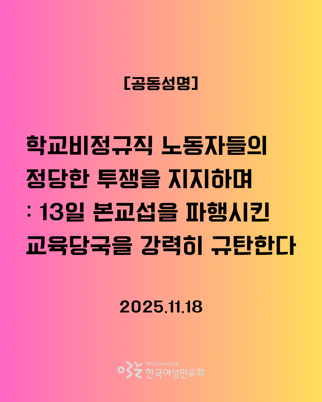 학교비정규직 노동자들의 투쟁은 교육현장을 더 평등하고 안전하게 만들기 위한 정당한 권리행위이며, 여성노동에 대한 구조적 차별을 바로잡는 사회적 요구이다. 교육당국은 즉각 태도를 전환하고 책임 있게 교섭에 나서야 한다. 우리는 학교비정규직 노동자들과의 연대를 멈추지 않을 것이며, 차별 해소와 노동권 보장을 위해 끝까지 함께 싸울 것이다.