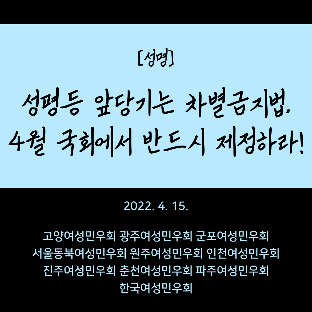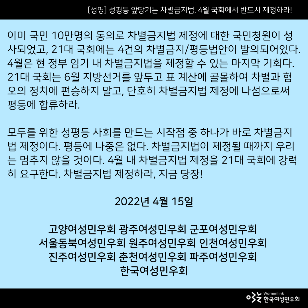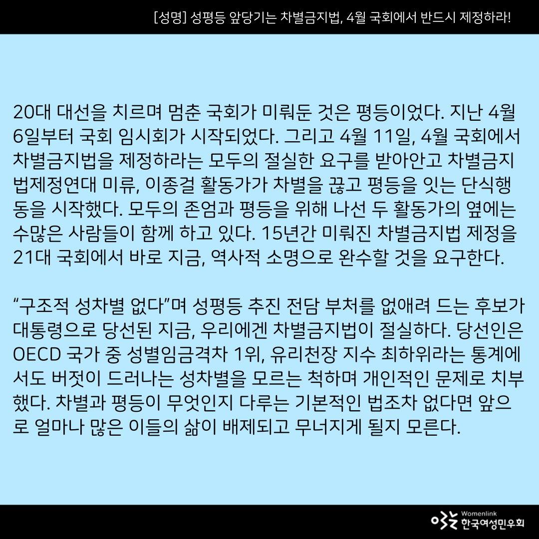 모두를 위한 성평등 사회를 만드는 시작점 중 하나가 바로 차별금지법 제정이다. 평등에 나중은 없다. 차별금지법이 제정될 때까지 우리는 멈추지 않을 것이다. 4월 내 차별금지법 제정을 21대 국회에 강력히 요구한다. 차별금지법 제정하라, 지금 당장!