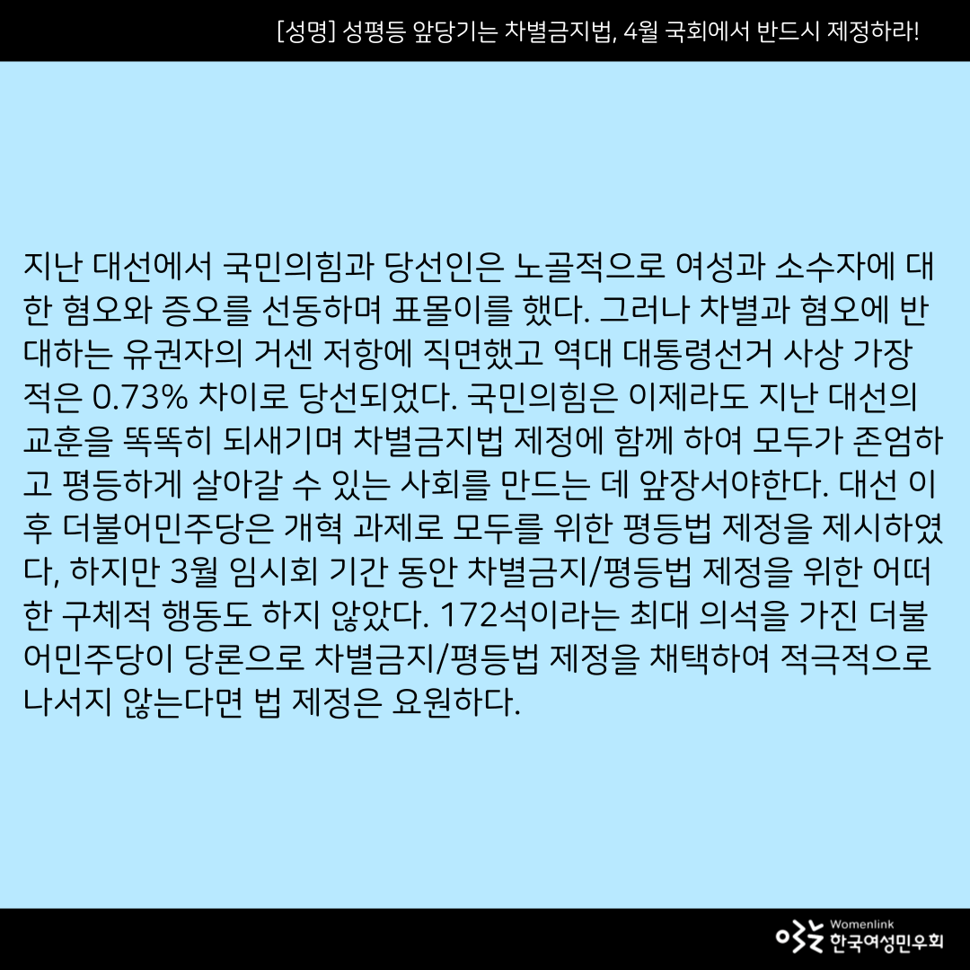지난 대선에서 국민의힘과 당선인은 노골적으로 여성과 소수자에 대한 혐오와 증오를 선동하며 표몰이를 했다. 그러나 차별과 혐오에 반대하는 유권자의 거센 저항에 직면했고 역대 대통령선거 사상 가장 적은 0.73% 차이로 당선되었다. 국민의힘은 이제라도 지난 대선의 교훈을 똑똑히 되새기며 차별금지법 제정에 함께 하여 모두가 존엄하고 평등하게 살아갈 수 있는 사회를 만드는 데 앞장서야한다. 대선 이후 더불어민주당은 개혁 과제로 모두를 위한 평등법 제정을 제시하였다, 하지만 3월 임시회 기간 동안 차별금지/평등법 제정을 위한 어떠한 구체적 행동도 하지 않았다. 172석이라는 최대 의석을 가진 더불어민주당이 당론으로 차별금지/평등법 제정을 채택하여 적극적으로 나서지 않는다면 법 제정은 요원하다.