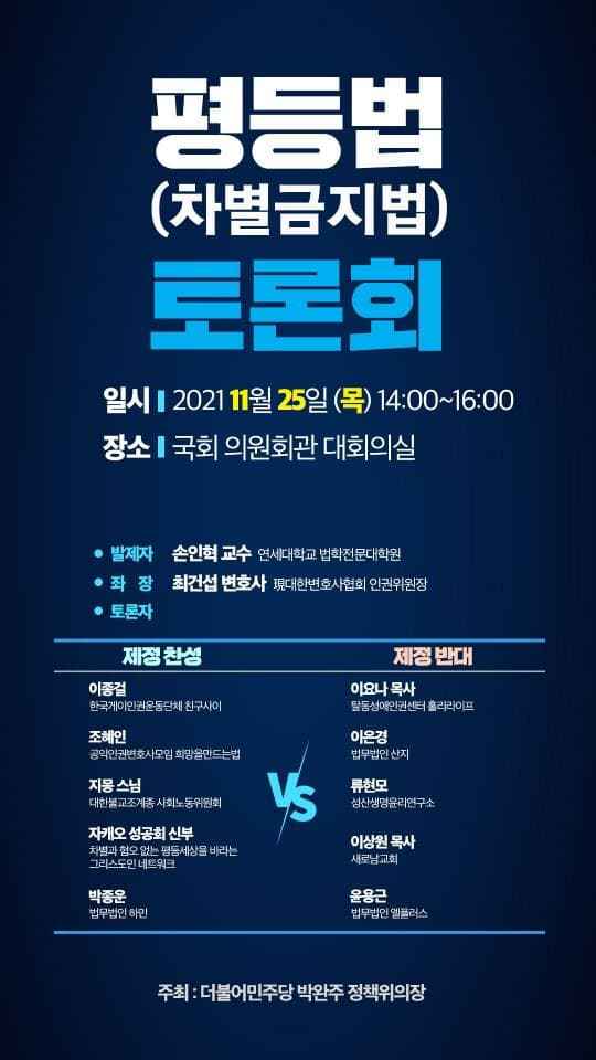 저는 11월 25일(목) 더불어민주당 정책위원회가 주최하는 ‘평등법(차별금지법)’ 토론회에 토론자로 참석합니다.