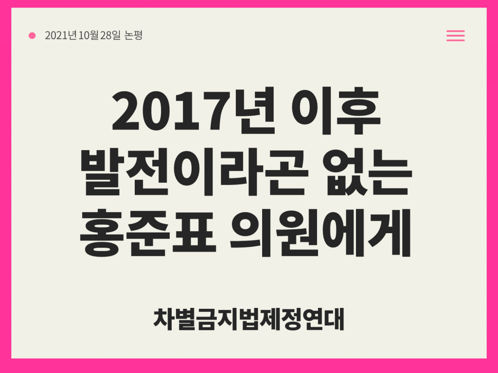 셋, 그래서 포괄적 차별금지법이 시급하게 필요하다. 헌법의 가치를 실현하기 위해. 동등한 시민으로서 성소수자의 권리를 삭제하려는 혐오의 정치를 끝내기 위해.