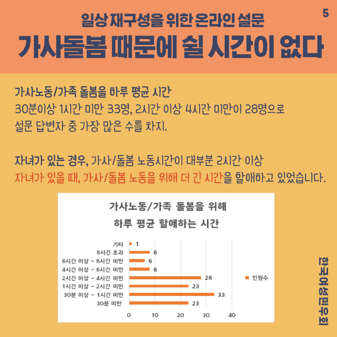 - 온라인 설문 참여자 130명과 일상 재구성 집담회 참여자 14명의 이야기를 통해 본 여성들이 일상을 영위하기 어려운 조건 -