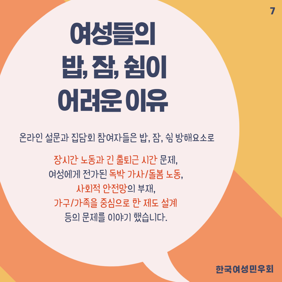지금까지 여성들이 밥, 잠, 쉼을 하기 어려운 조건에 대해 살펴 봤는데요.