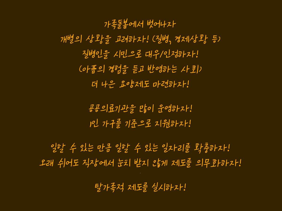 "질병인을 시민으로 대우하고 인정하는 것. 아픔의 경험을 들어야 된다고 생각해요. 저도 지금은 나의 아팠던, 아프고 있는 경험이 이미 아파 온 사람들, 또는 아플 사람들에 대한 좋은 자원이 될 수 있다고 생각하거든요."