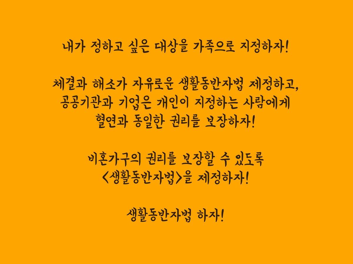 - 비혼가구의 권리를 보장할 수 있도록 <생활동반자법>을 제정하자!