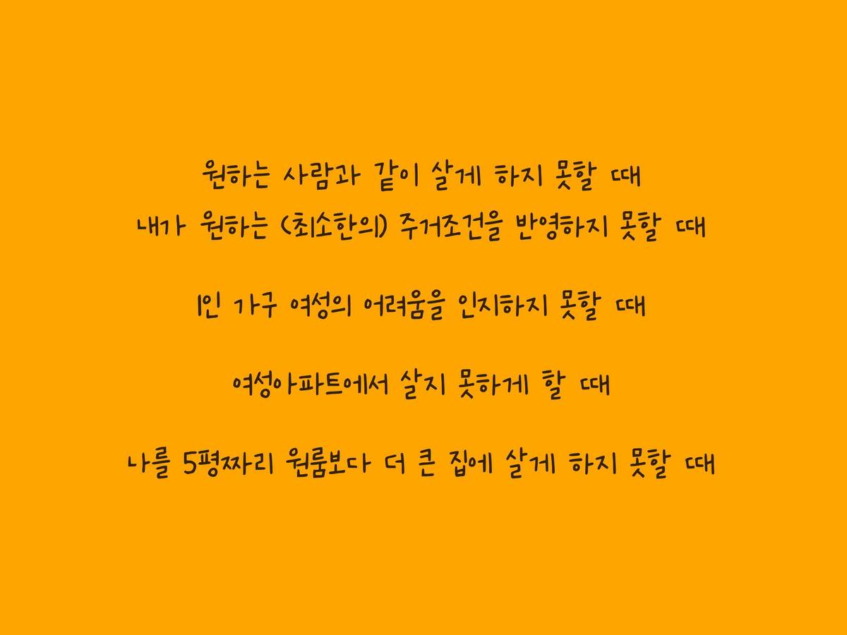 "살 만한 집이라고 하는 게 아파트거나 신축이거나 그렇잖아요. 그런 데는 대부분 결혼해야 들어갈 수 있는. 그러니까 혼자 살거나 아니면 뭔가 그런 제도에서 소수라고 불리는 사람들은 대부분 빌라에 살아야 되거나 아파트에서는 살 수 없어요."