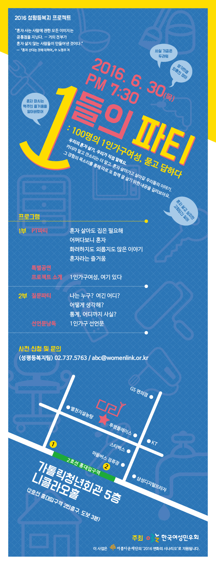 일시 : 2016년 6월 30일(목) 저녁 7시 30분 장소 : 가톨릭 청년회관 5층 니콜라오홀 (2호선 홍대입구역 2번 출구, 도보 3분) 문의 :02.737.5763/[email protected] * 사전신청 필수! 신청자 많을시, 조기 마감될수 있습니다. * 과거 혼자살아본 경험이 있거나, 현재 혼자살고 있는 여성이라면 누구나 신청가능합니다. |